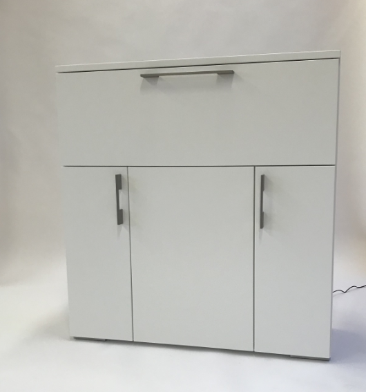 Ganz nach den Wünschen der Kundin - passend zu Ihrer Einrichtung - passend für Ihre Zwecke - haben wir einen " kleinen Sekretär " angefertigt. Beim öffnen der Schreibplatte wird die LED - Beleuchtung automatisch eingeschaltet. Aus optischen Gründen wird die mittlere Tür mit einem " Push to open " geöffnet - symmetrische Anordnung der Griffe.